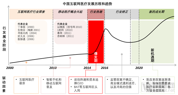 2010 年前后,智能手机和移动互联网引发了新的热潮,移动医疗的概念开始逐渐兴起,一批带有移动互联网基因的公司出现,以微医(挂号网)、1药网、春雨医生、杏树林等为代表的一批更年轻的公司逐渐成长。