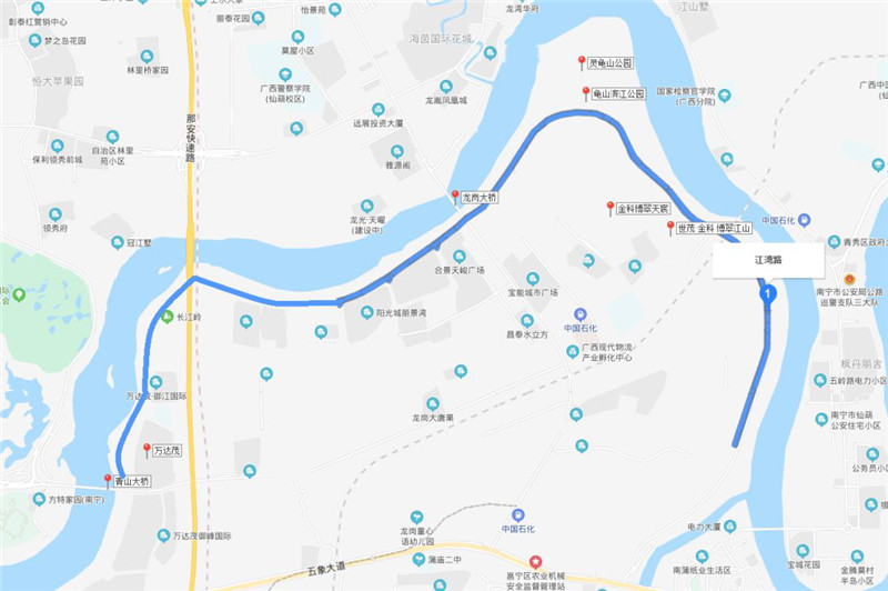 一侧是商住区域的繁华热闹,一侧是沿江绿地的荫郁葱茏,一条江湾路,打造出南宁醉美的风景线。