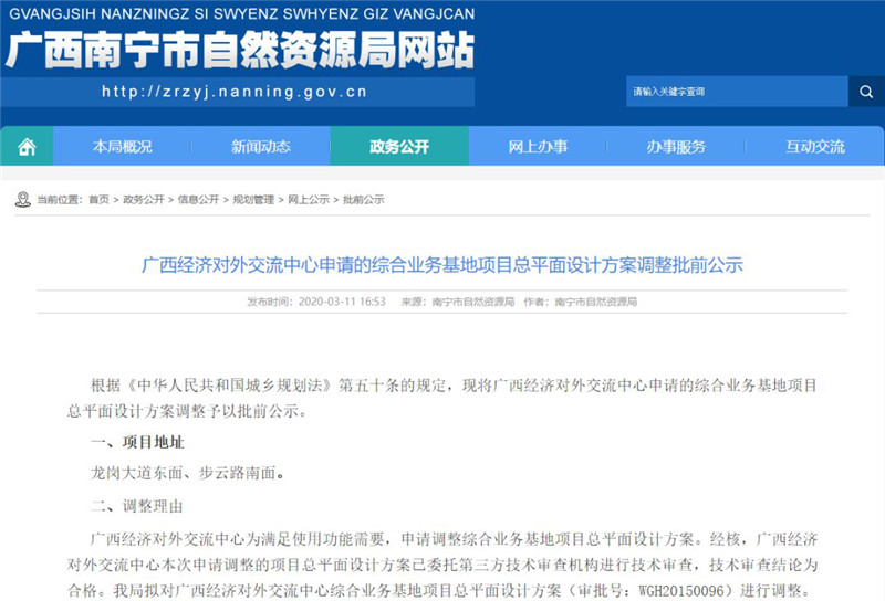 2020年3月11日,广西南宁市自然资源局官网上发布了一则信息,即广西经济对外交流中心申请的综合业务基地项目总平面设计方案调整批前公示公告,对外窗口即将入驻龙岗东,片区产业即将升级。