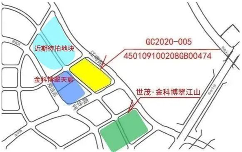今年2月26日,春节后的南宁首次土拍,位于江湾路东段西侧世茂·金科博翠江山、金科博翠天宸附近的GC2020-005沿江地块,吸引了彰泰、金科、旭辉等18家房企争相竞逐,最终以5.48亿元高价一锤定音。