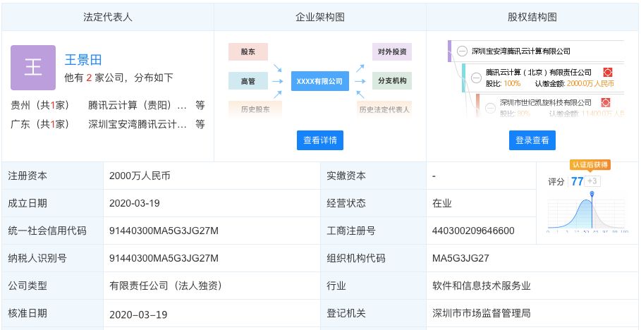 天眼查数据显示,3月19日,深圳宝安湾腾讯云计算有限公司成立,该公司注册资本2000万元,法定代表人为腾讯云副总裁王景田。据悉,这家公司由腾讯云的运营主体腾讯云计算(北京)有限责任公司全资控股。