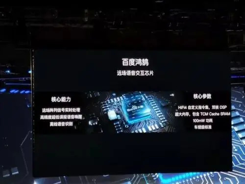 2019年7月百度AI开发者大会上,百度宣布推出一款新的芯片——远场语音交互的芯片“鸿鹄”。据介绍,鸿鹄芯片使用了HiFi4自定义指令集,双核DSP核心,平均功耗仅100mW。这款芯片是根据车规级标准打造,将为车载语音交互、智能家具等场景带来便利。