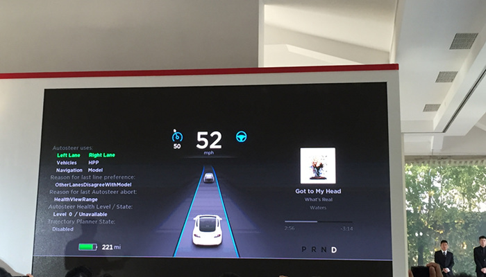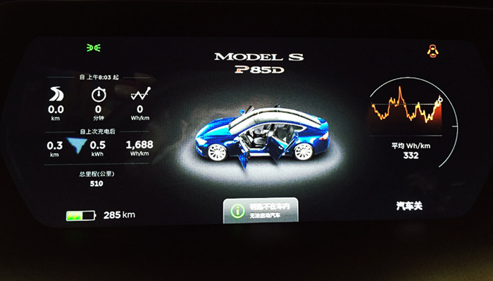6. 当在城市周围低速行驶时,一旦特斯拉检测到停车位置,仪表板上则会出现“P”字样。自动驻车指南会在触摸屏上连同后置摄像头一起出现,一旦启动了,它将会通过控制方向盘和车速来实现自动停车。 利用来自超声波传感器的数据,自动泊车系统可确定与路缘和其他停放车辆的接近度。只要Model S行驶速度低于24km/h,自动泊车系统就可以检测到长度大约为6米的潜在平行停放区域。车主只需点击触摸屏上的“开始自动泊车”,按照触摸屏上的说明执行,只需等待系统将自动停放好车辆,显示“已完成”的消息。 另外,装配自动驾驶部件的Model S,前视摄像头会对车辆所在行车道上的标志进行检测,超声波传感器则会检测盲区是否有车辆。Model S已检测到明显的公路标志,同时,主动巡航控制系统以及自动转向系统图标的出现也说明自动驾驶系统的开启已准备就绪。连续两次快速拉动巡航控制手柄然后这个图标将会变蓝,这就说明自动转向系统以及主动巡航控制系统已经开启。