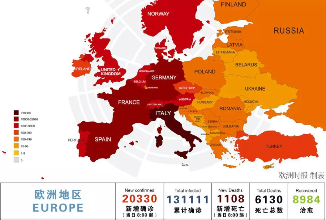 自3月16日中国以外新冠肺炎累计确诊病例数已超过中国数字以来,欧洲已经成为全球疫情的新“震中”。