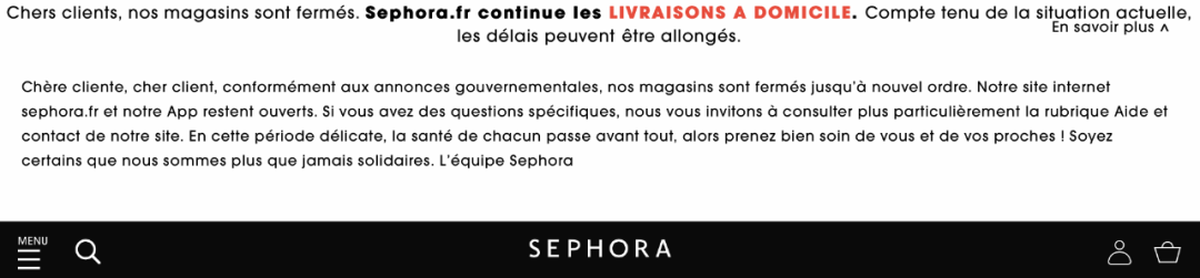 丝芙兰法国官网也于日前挂出声明,宣布门店将根据政府公告关闭,开业时间另行通知。在闭店期间,官网和手机应用会保持运作,关闭门店可为消费者提供送货上门服务。