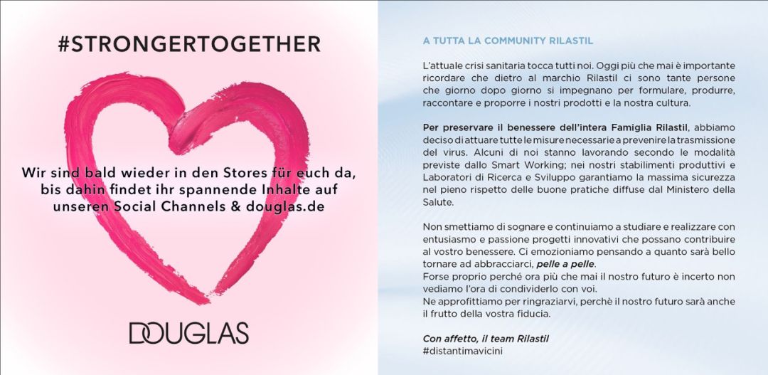 而在同为疫情严重程度欧洲前五的德国和瑞士,德国Douglas美妆连锁店于周三(3月18日)宣布关闭全国范围内所有分支机构。并称完全支持联邦和州政府要求,呼吁消费者遵循官方准则,主动限制社交。