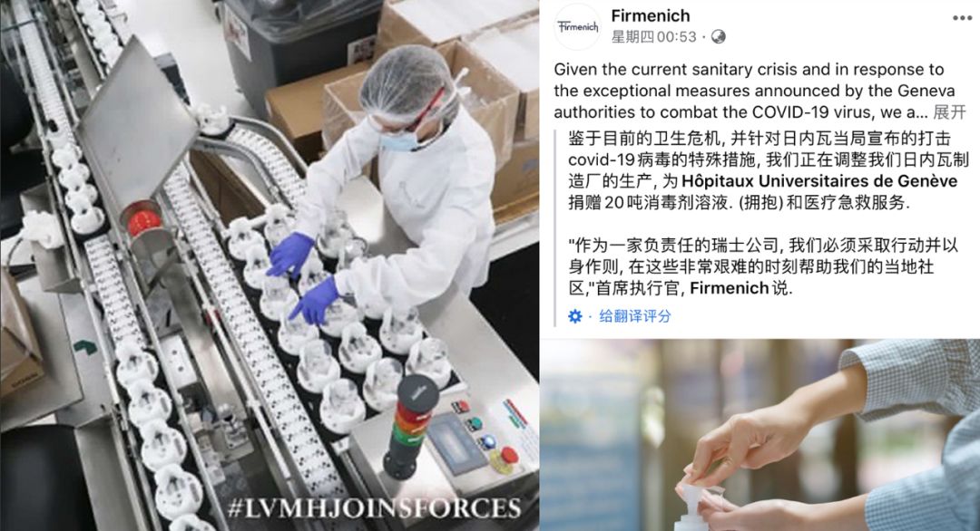 3月15日,LVMH集团宣布将用迪奥、娇兰和纪梵希的3个香水和化妆品工厂生产线,大量生产洗手液,免费提供给法国健康机构和医院等,以应对紧缺问题。