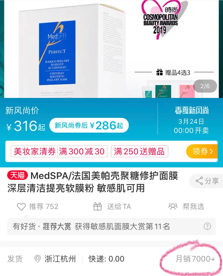 △ 法国美帕(MedSPA)天猫旗舰店上,明星产品壳聚糖面膜月销量7000+件