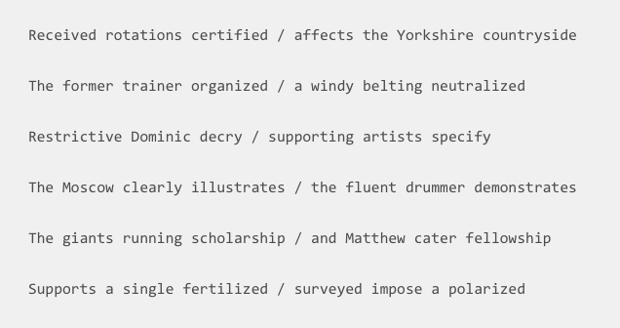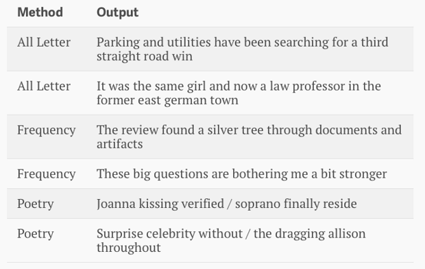 他们首先尝试了“全字母法”,让1来映射特定的字母,让0来映射其余的字母,然后造出有意义的句子。第二种方法“频率法”也有着相同的操作思路,但是它让一些少见的单词,每个字母代表好几个1和0,整个造出来的句子就更短了。最后,他们用两个8音节的短句来写诗,诗歌节奏模式是抑扬格五音步,同时还压着尾韵。下面是一些结果: