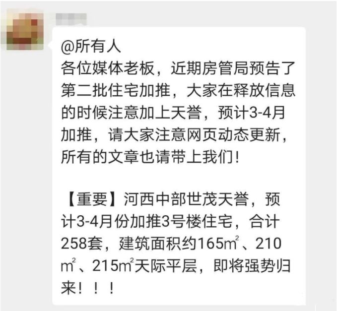 值得注意的是,河西另一大热盘世茂天誉加推计划有变,预计在3—4月份加推3号楼,共计258套房源(按照30%的比例,其中77套将作为人才房),建筑面积约165㎡、210㎡、215㎡,前期均价为45000元/㎡。年前项目对外释放加推2号楼共154套大平层,建筑面积约165-380㎡。