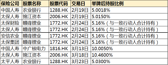 蓝鲸保险注意到,目前险资南下布局港股频率加快,截至目前,已有中国人寿、太平人寿、太保寿险、安信农业、太保财险、太保集团分6次举牌农业银行、锦江资本(2006.HK)、赣锋锂业(1772.HK)、中广核电力(1816.HK)4只港股。