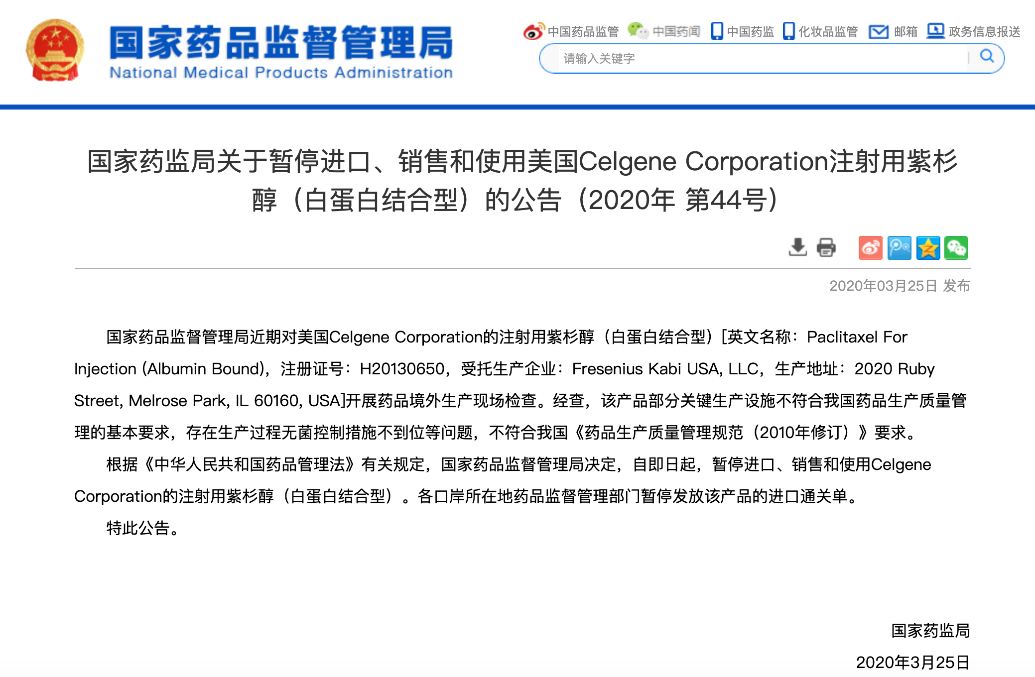 3月25日下午,国家药监局发布公告,宣布暂停进口、销售和使用新基(Celgene Corporation)生产的原研注射用紫杉醇(白蛋白结合型)(商品名Abraxane)。
