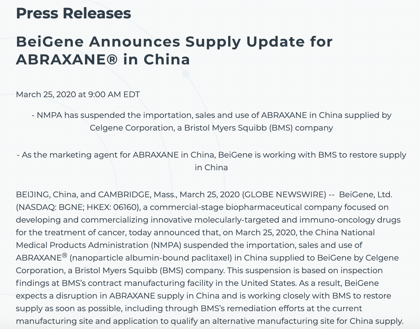 对此百济神州方面3月25日对界面新闻回应称,公司正在与百时美施贵宝(新基母公司)密切合作以尽快恢复供应,除了正在进行的、对现有合同生产机构的整改工作外,百时美施贵宝已向国家药品监督管理局递交更换白蛋白紫杉醇生产厂的补充申请,从其另一家工厂为中国供货。该申请目前正在审评中。