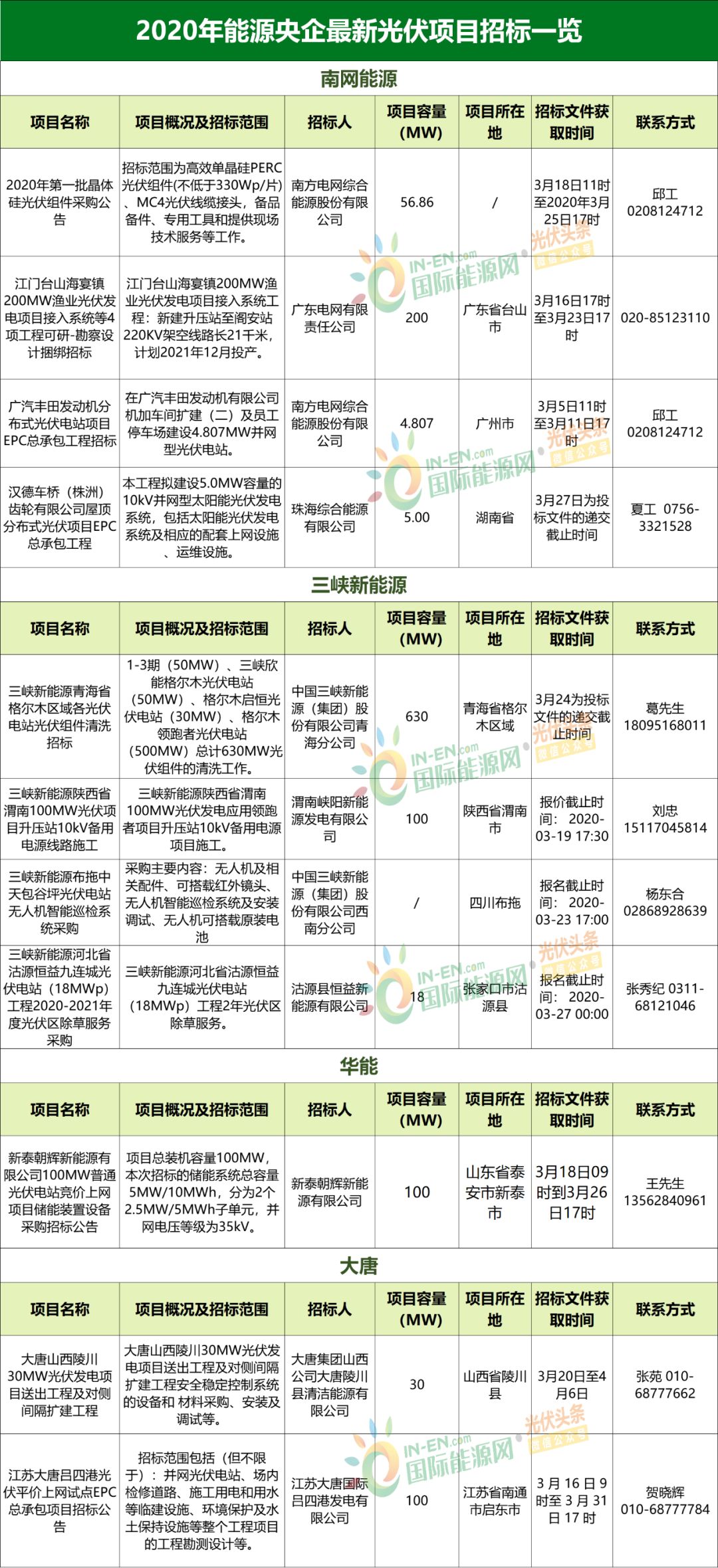 除了1.14GW的开标项目,国际能源网/光伏头条对能源央企最新的招标工作也进行了持续追踪,经不完全统计,南网能源、三峡新能源、华能、中广核等12大能源央企启动了2.3GW光伏项目及设备采购招标工作。