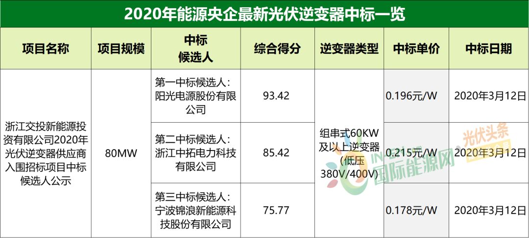 此外,在逆变器中标方面,值得关注的是3月12日浙江交投新能源投资有限公司发布的2020年光伏逆变器供应商入围招标项目,阳光电源、浙江中拓、锦浪科技为中标候选人。
