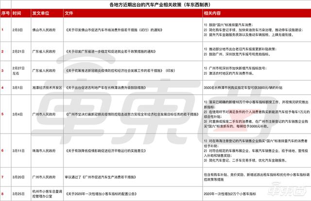 此后,广东省省委政府又在2月27日左右印发的《关于统筹推进新冠肺炎疫情防控和经济社会发展工作的若干措施》中表示,接下来广东省为了促进消费会“多措并举”,例如让广州市和深圳市加快新增汽车指标放号,优先保障家庭首购需求,与此同时进一步激活农村地区的汽车消费市场等等。