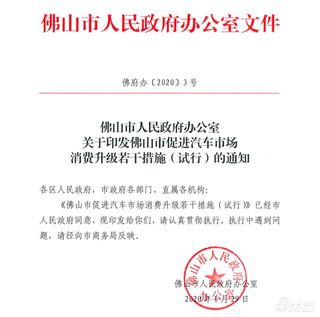2020年2月3日,广东省佛山市人民政府办公室发布了《关于印发佛山市促进汽车市场消费升级若干措施(试行)的通知》,佛山市也由此成为第一个出台激励汽车消费政策的地方政府。
