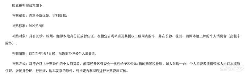 3月1日,湘潭经济技术开发区发布的《关于出台促进吉利地产车在长株潭消费升级鼓励措施》正式实施,长株潭市民购买吉利汽车湘潭九华基地生产的吉利缤越和全新远景,可获3000元/辆的补贴。不过,这项补贴活动只有前3500名个人消费者才能够享受。