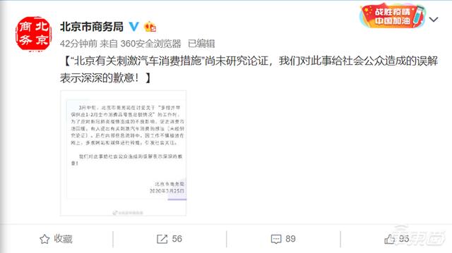 在流出的“乌龙新闻”中,北京市正在研究制定汽车消费政策措施,并计划在上半年一口气释放不少于10万个购车指标,以促进刚需家庭购车消费。第二天(3月25日),北京市商务局在官方微博上发布致歉声明,表明“北京有关刺激汽车消费措施”还没有研究论证。