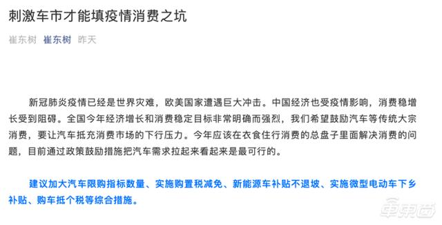 3月18日,乘联会秘书长崔东树在自己的个人微信号上发表了题为《刺激车市才能填疫情消费之坑》的文章,并在文章开篇直接了当地表明,他建议:加大汽车限购指标数量、实施购置税减税、新能源车补贴不退坡、实施微型电动车下乡补贴、购车抵个税等综合措施。