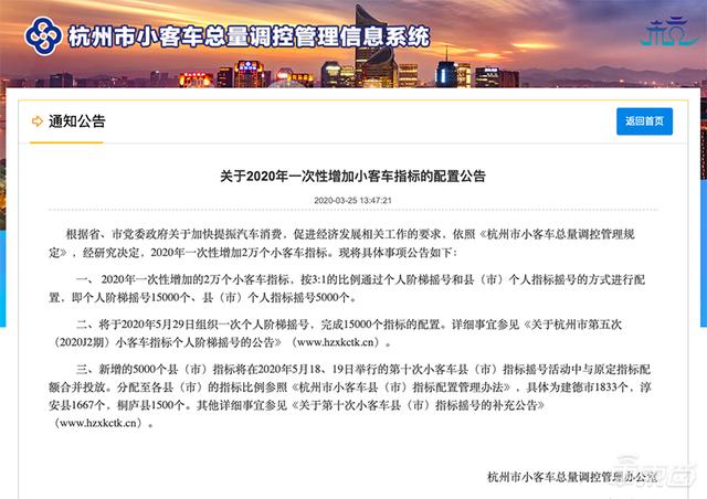 3月25日,杭州市小客车总量调控管理办公室发布《关于2020年一次性增加小客车指标的配置公告》,明确将在今年一次性增加2万个小客车指标。