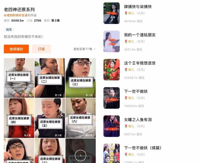 古风内容创作者“御儿.(古风)”可谓是古风类短剧的“产粮大户”,其当前在快手发布了包括《九鹿美兮》《人鱼村庄》《双世丑妃》《这个王爷我想退货》《下一世不做妖》等在内的23部系列短剧,集数从最初的几集、十几集到现在的几十集。真实的朝代场景、讲究的古代妆发、专业的演员配音……这些无论是制作水准、场面调度,还是演员演技,丝毫不逊色于古装影视剧。其中《这个王爷我想退货》快手累积播放量达3.2亿,御儿本人的快手粉丝数也已达1178万。