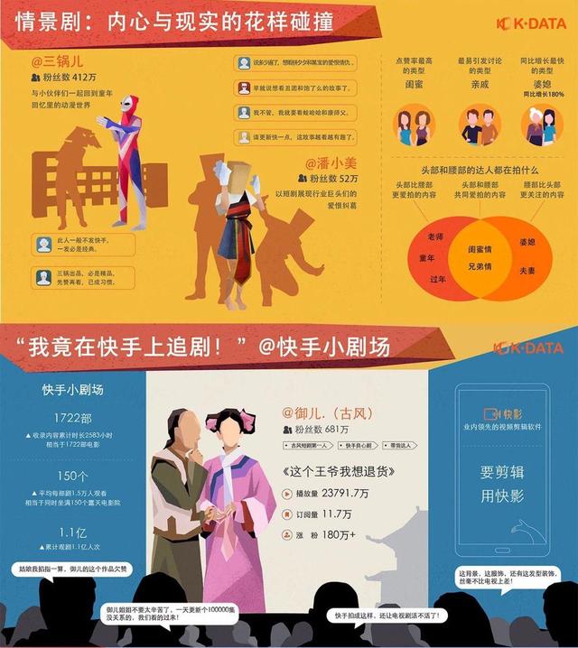 2019年4月,快手APP上线“小剧场”板块,用户上传短剧时带上标签就有机会被剧场收录,该板块界面内包含精选、恋爱、动漫、搞笑、美食圈等分类,以及今日最热榜和最新好剧榜;4个月后,快手为其平台内的短剧内容专门上线独立APP“追鸭”,以进一步整合短剧内容。 据快手大数据研究院发布的《2019快手内容生态报告》显示,快手小剧场已收录1722部情景剧,累积观影人次高达1.1亿,平均每部有1.5万人观看,相当于同时坐满150个露天电影。