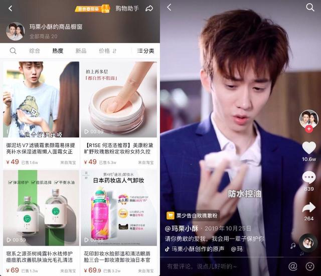 以玛栗小酥为例,该账号日常在抖音与快手同步更新,在其抖音账号个人主页的商品橱窗内已拥有不少第三方电商平台的商品,可在视频或直播间中进行添加与分享。其中,售价49元的美康粉黛旷野玫瑰散粉带货销量为5.3万、售价69.9元的花印卸妆水带货销量为3.2万、售价49元的御泥坊V7素颜霜带货销量为1.6万。按照抖音平台抽取10%的分成、淘宝抽取6%分成的规则,一般商品橱窗内商品佣金在30%到70%之间,扣除和商家沟通的商品佣金费用,收入相当可观。