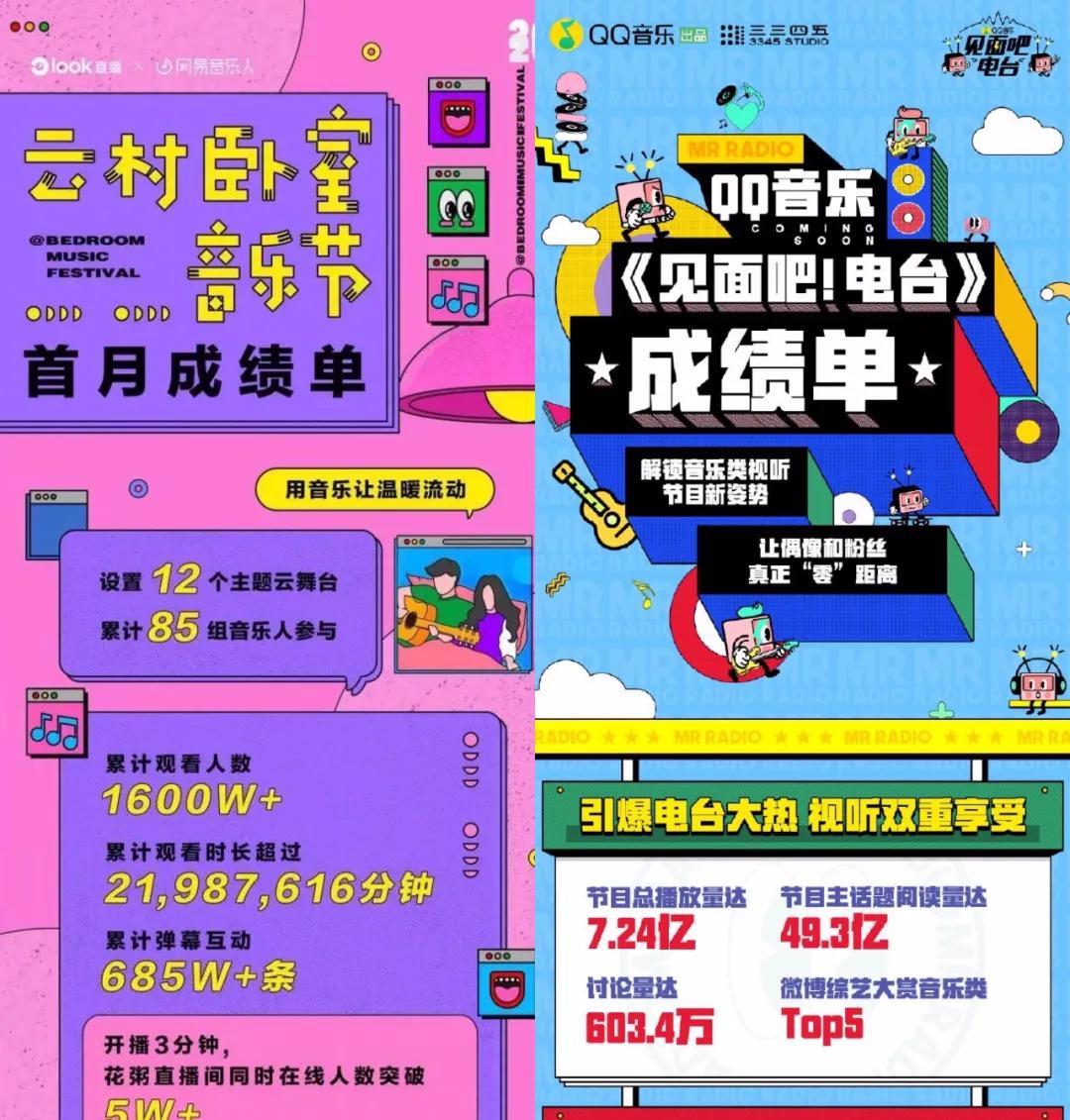 另一边,QQ音乐的“见面吧电台”第二季收官报告显示,共有262位艺人做客电台,节目总播放量达7.24亿,助力新歌宣发240首,节目直播平均播放量超747.2万小时。能够看出,平台在特殊时期推出的这些云音乐直播活动,都具有一定热度和影响力。
