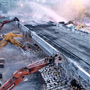对讲机一声号令,332人齐开动,53台液压破碎机及100余台配套机械设备同时启动,拆除施工正式开始。