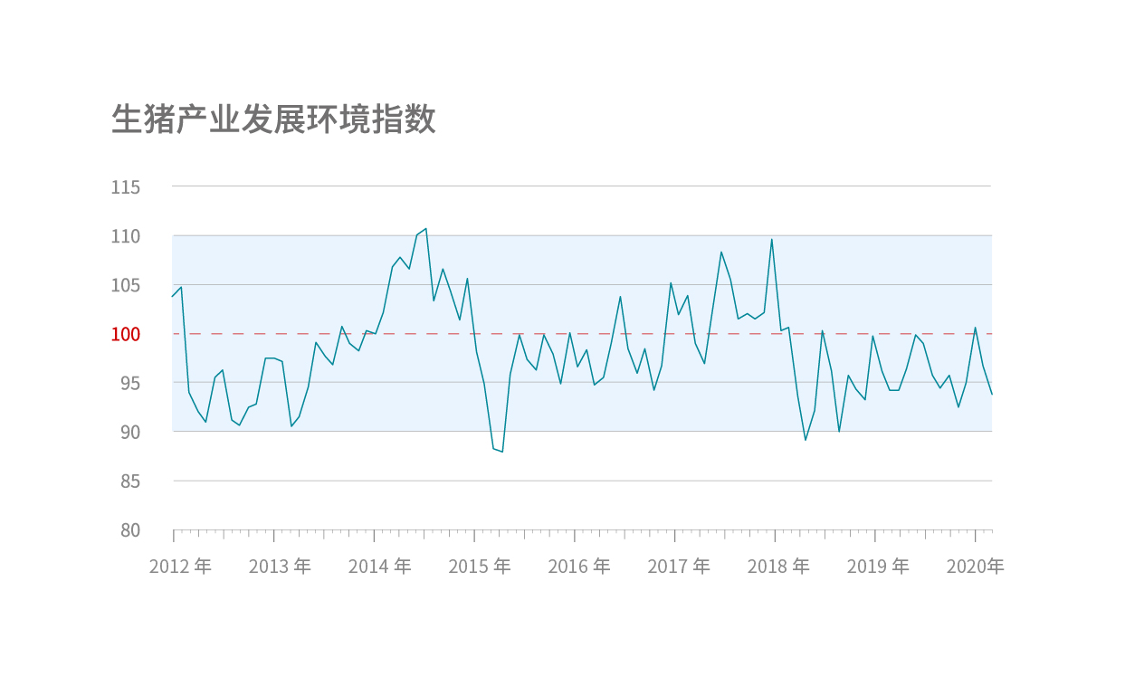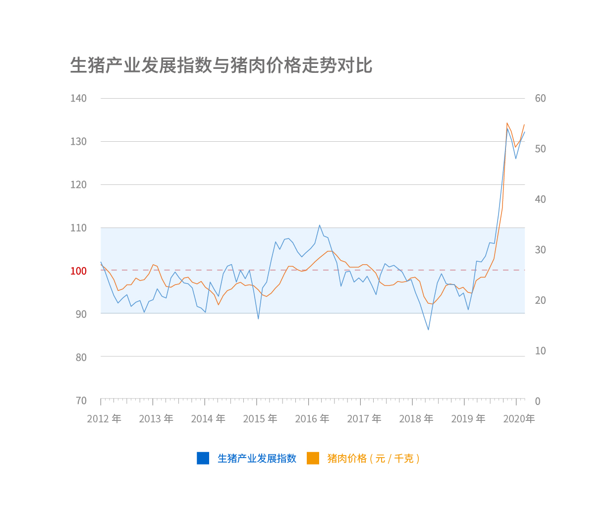 生猪产业发展指数以90-110 作为标准区间,在此区间内表示产业运行较为平稳,此区间以外均表示生猪产业运行存在异常。低于90视为产业“过冷”,高于110视为产业“过热”。