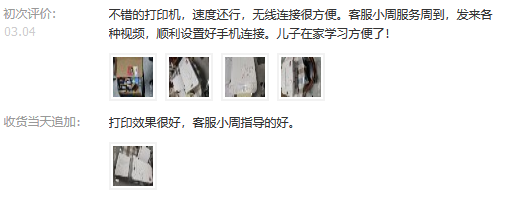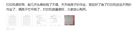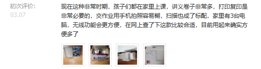 我们可以看到家庭打印机的最主要好评来源于给孩子打印学习资料,我们抽取的排名前10的打印机的买家评论,提到打印机用处的评论作为学生使用率为94.3%。因此学生,尤其是K12阶段学生的家庭成为了打印机消费的主力军。
