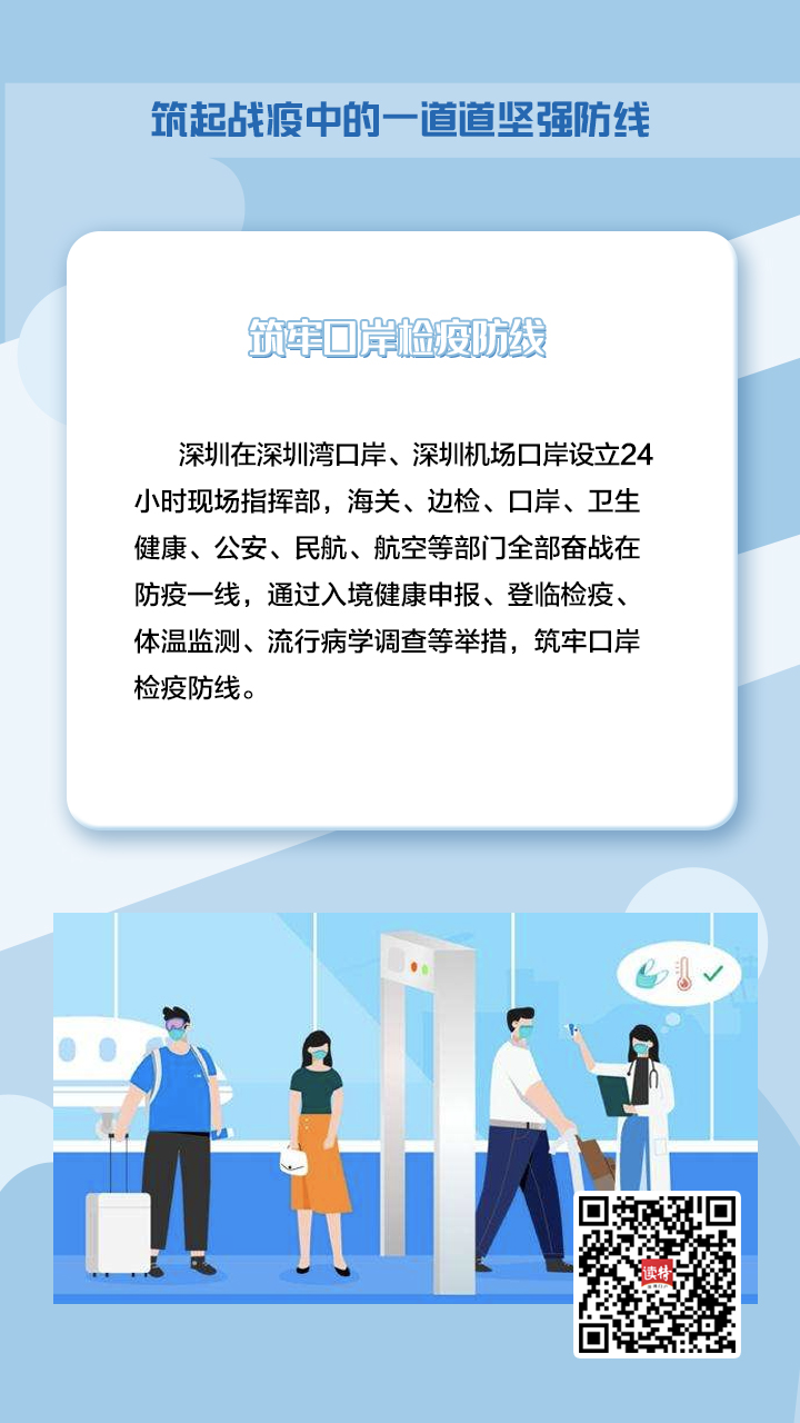 深圳在深圳湾口岸、深圳机场口岸设立24小时现场指挥部,海关、边检、口岸、卫生健康、公安、民航、航空等部门全部奋战在防疫一线,通过入境健康申报、登临检疫、体温监测、流行病学调查等举措,筑牢口岸检疫防线。