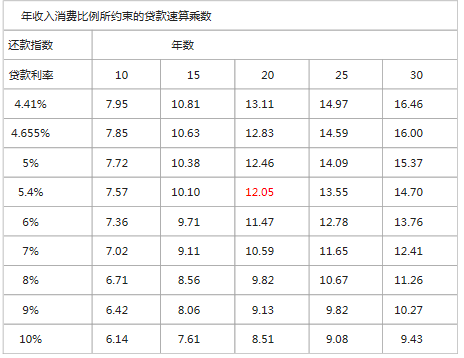 ◆ 具有还款能力的贷款=年收入非消费部分×速算指数 对于年收入的多少用于消费,这里,融360可以给您提供一个参考:夫妻合计税后年收入20万元的家庭,消费比例50%到70%。而针对收入较高的家庭,人们在长期的理时规划中总结出一个一般化的规则:4321理财定律——收入40%供房及其他投资,30%生活开支,20%存款,10%保险。