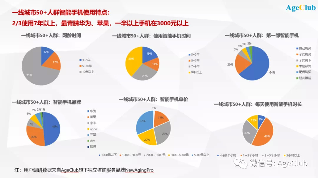 AgeClub旗下独立咨询业务品牌NewAgingPro最近一年对大量的一线城市50+用户深度调研,发现2/3以上的受访者有7年以上的智能手机使用历史,39%的受访者有9年以上的智能手机使用历史,恰好与这个节点相吻合。