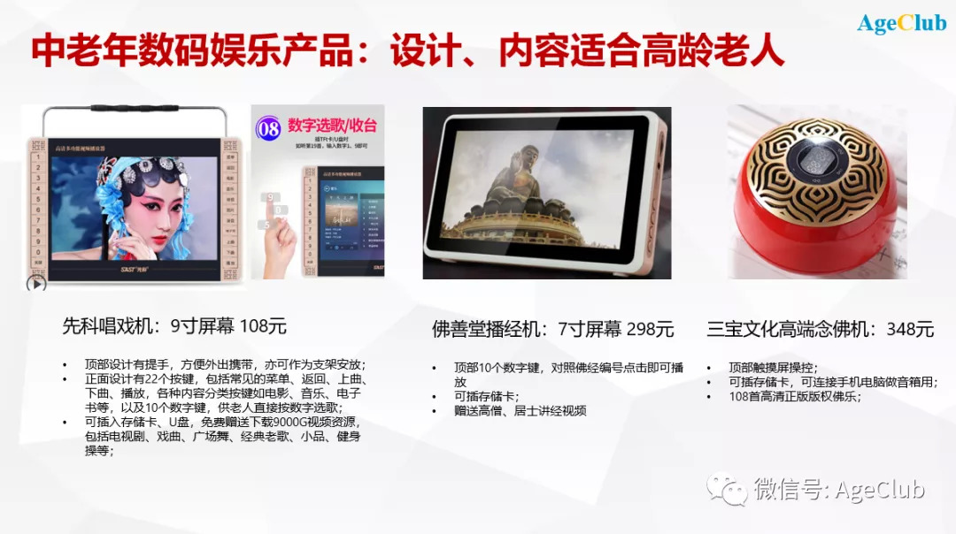 但这些产品在产品形态、功能上都很雷同,大多是在蓝牙音箱、平板电脑等产品上做一些定制开发,内置或附赠老人可能喜欢的音乐、戏曲、评书、相声、佛经等内容;