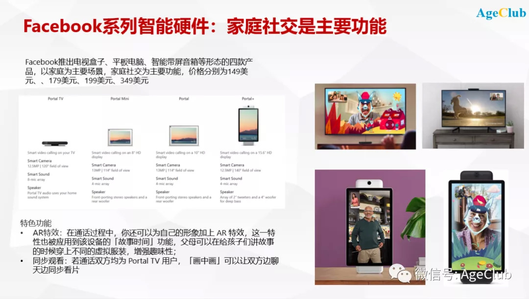 社交巨头facebook更是推出一系列以家庭社交为主打功能的产品,如电视盒子Portal TV、平板电脑Portalmini(8寸屏)、Portal(10寸屏)、智能带屏音箱portal+(15.6寸屏)。