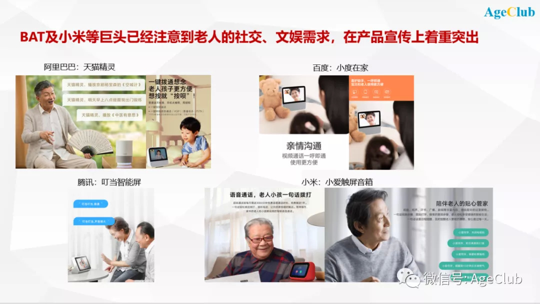 近几年国内互联网巨头阿里、腾讯、百度、小米等推出的智能音箱、智能屏等产品也将老人与家人的视频通话作为重点功能来宣传。