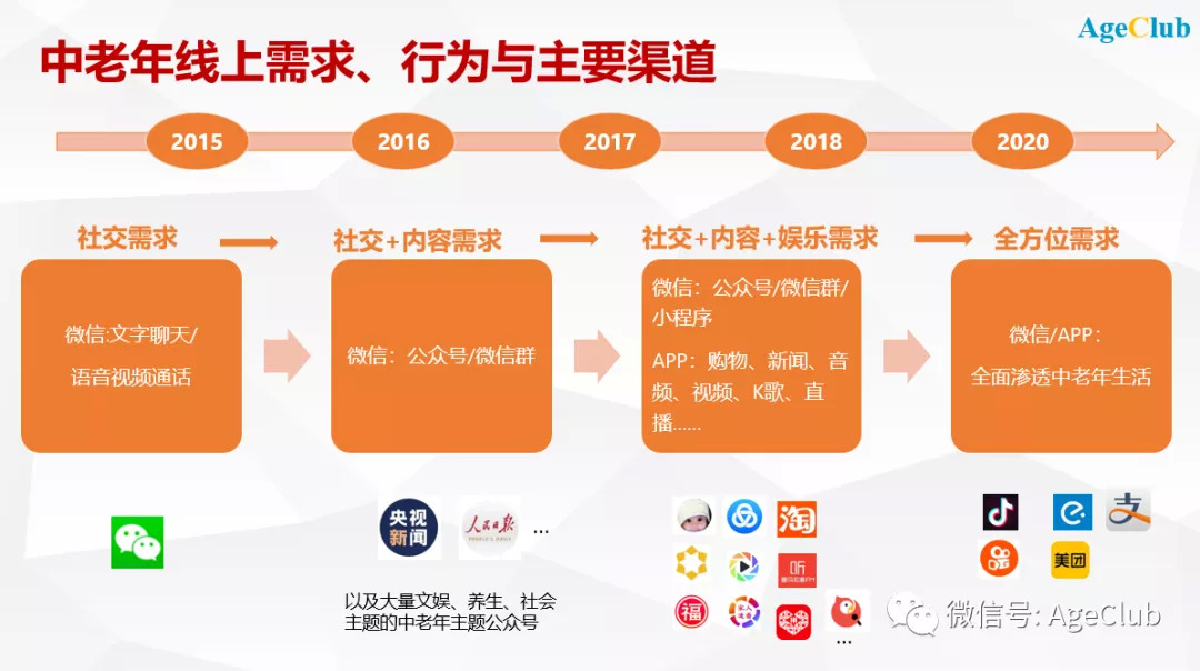 这一年,早已在年轻人中成为第一应用的微信,开始在中老年群体普及,随后从一二线城市逐渐渗透至三四线直至乡镇的中老年群体。