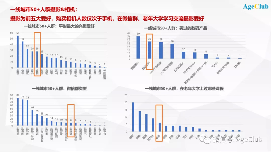 AgeClub旗下独立咨询业务品牌NewAgingPro对一线城市50+用户深度调研中发现,摄影在受访者的兴趣爱好排序中位居并列第四位,不少人会加入专门的摄影群学习交流,并主动去网上和老年大学学习摄影课程;