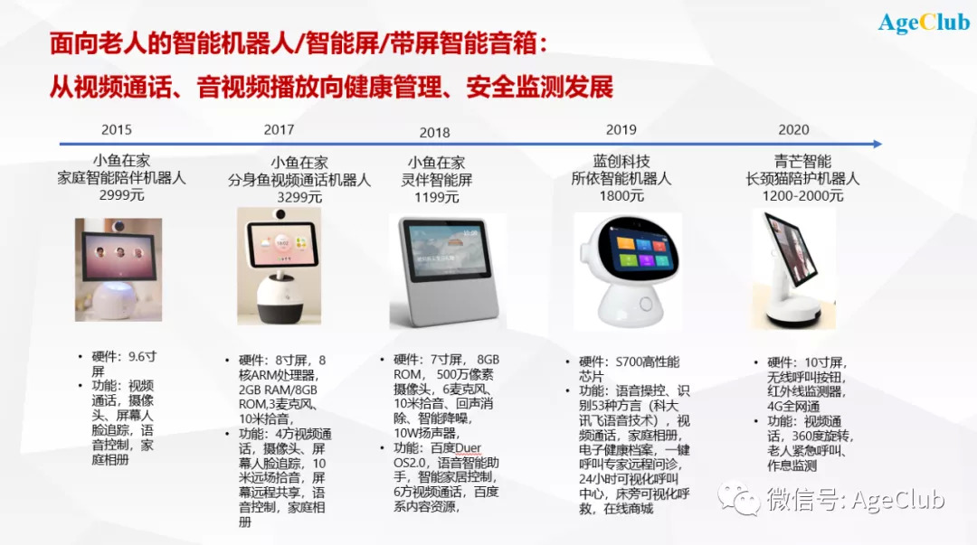 比如去年并入百度的智能硬件厂商小鱼在家,在2015年推出国内首款家庭智能陪伴机器人的,2017年推出分身鱼视频通话机器人,2018年推出灵伴智能屏,均是以中老年人和儿童为主要服务对象。