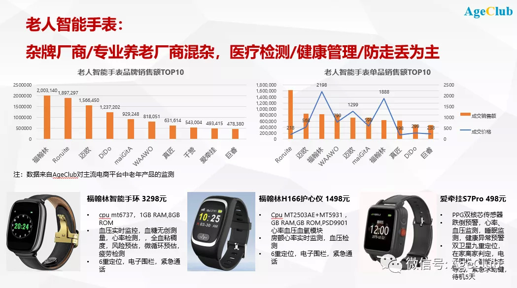 国内的智能手表/手还也开始越来越重视中老年群体。AgeClub对电商平台上的老人智能手表进行分析,发现产品主要分三种: