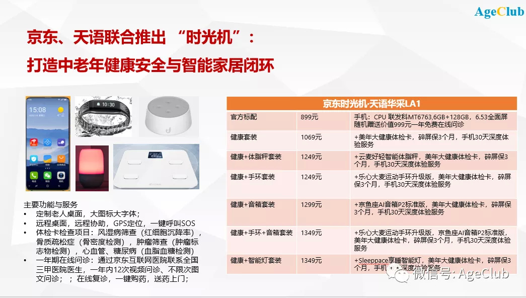 3.亚马逊、Facebook、华为、小米纷纷推出智能带屏音箱或智能电视主打家庭社交,小米生态链企业华米科技推出面向老人的健康手表和服务包,电商巨头京东联合手机厂商天语推出老人智能手机“京东时光机”,并打造完整的健康医疗服务闭环。