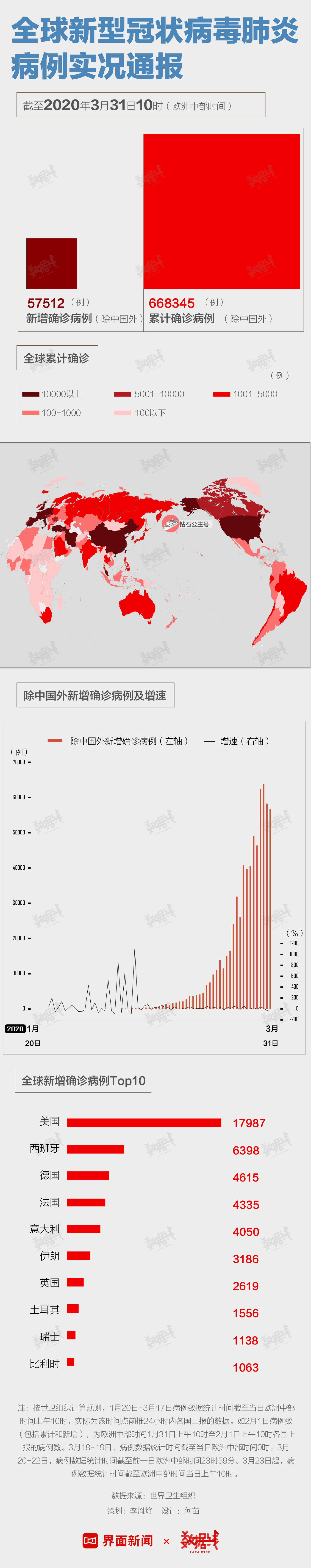 根据WHO每日情况报告,截至欧洲中部时间2020年3月31日10时,除中国外新增确诊病例出现连续两日下降,为3月份首次。