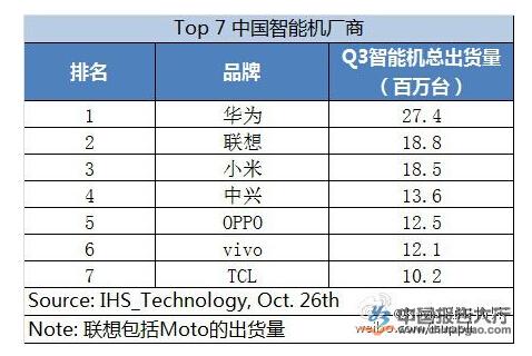 2015年Q3国内智能手机市场出货量排行:日前,中国报告大厅数据统计机构公布了国内智能手机厂商第三季度出货量排行榜。在榜单中,华为以2740万台的销量排名第一,而小米仅为1850万台左右。