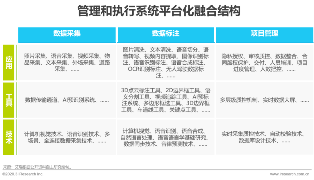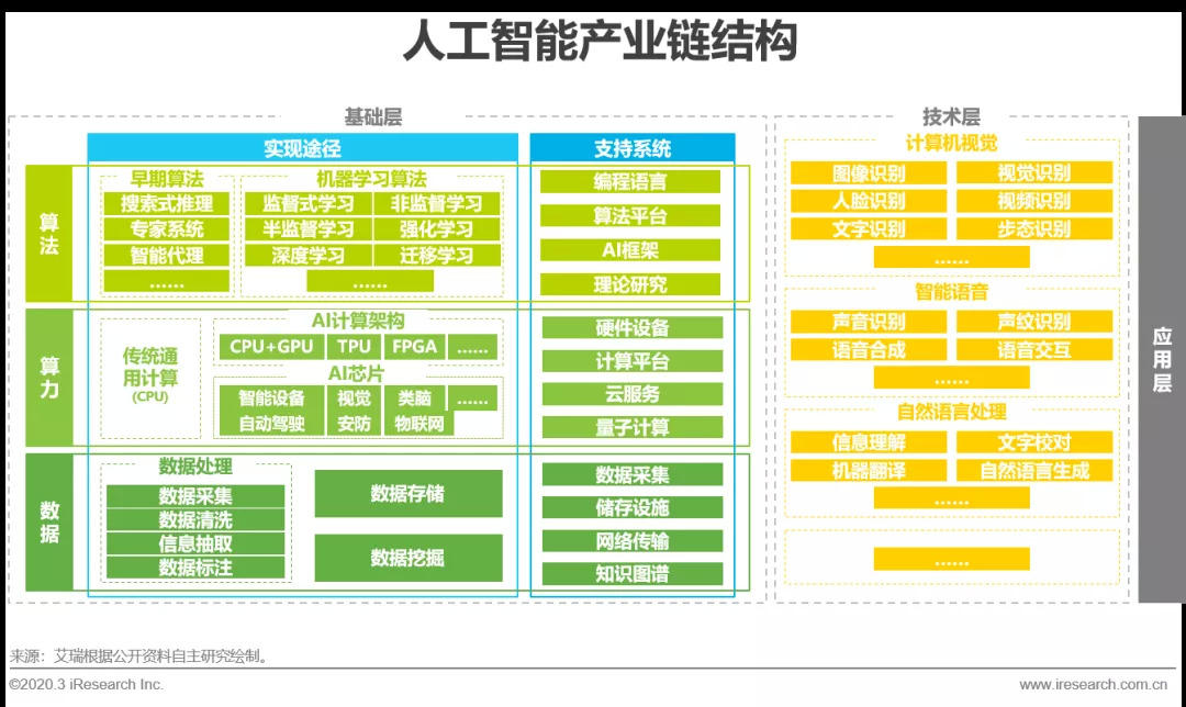 自从2012年深度学习在图像和语音方面产生重大突破后,人工智能便真正具备了走出实验室步入市场的能力,2016年AlphaGo的胜利再次引爆行业,成功唤起了中国市场的兴趣,时至今日,人工智能的商业化在中国得到了长足发展,在安防、金融、企服等领域纷纷落地开花,同时也真正意义上衍生出了一套完整的产业链。AI产业链可以分为基础层、技术层和应用层,基础层按照算力、数据和算法再次划分,对整体上层建筑起到支撑作用;技术层根据算法用途分为计算机视觉、智能语音、自然语言处理等,是AI最引人注目的环节;应用层则按照不同场景的需求定制开发专属服务,是AI真正赋能行业的方式。目前人工智能商业化在算力、算法和技术方面基本达到阶段性成熟,想要更加落地,解决行业具体痛点,需要大量经过标注处理的相关数据做算法训练支撑,可以说数据决定了AI的落地程度,而AI基础数据服务行业又鲜有关注,因此本报告承接艾瑞《2019年中国人工智能基础数据服务白皮书》,再次挖掘该行业的现状和发展,展示其真实的一面。
