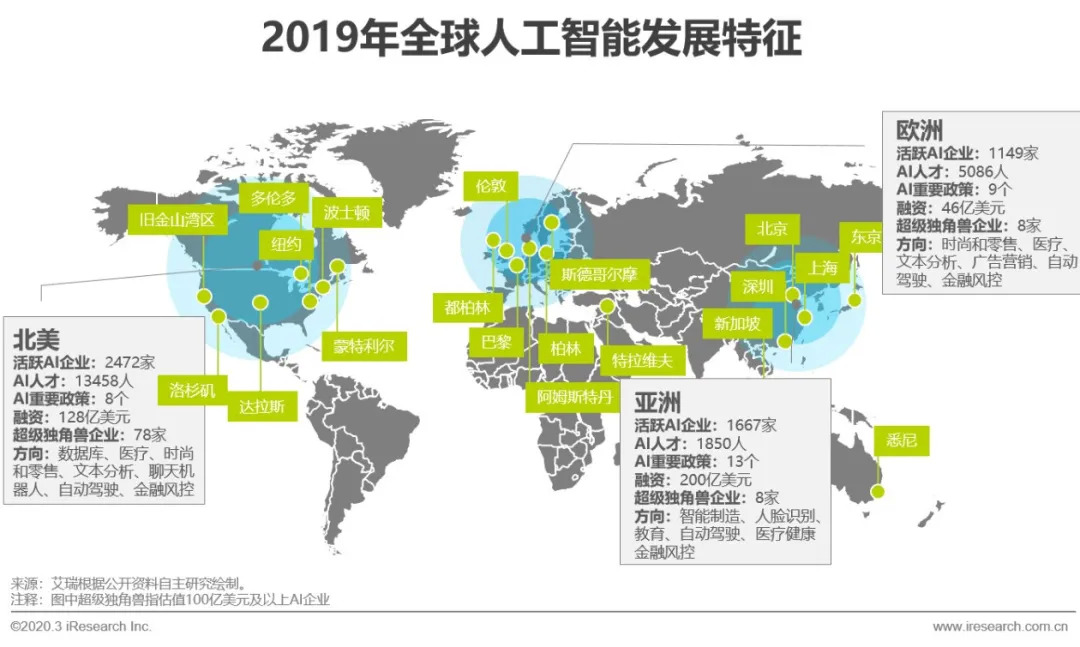 2019年全球人工智能行业发展依旧火热,重点围绕北美、欧洲和亚洲三大区域发展,共有5386家活跃企业,27400名高级研究人员,20座重点发展城市,产生了约374亿美元融资,其中自动驾驶、药物医疗、人脸识别、视频内容和金融反欺诈是获得融资最多的领域。综合来看,美国仍然是人工智能领域的领头羊,每年不仅向全球输出最前沿的AI应用概念,提供最接近市场需求的应用场景,同时也吸收着世界各地不断涌入的人才、数据资源和创意灵感。以英国、德国为代表的欧洲发展区和以中国、日本、新加坡、印度为代表的亚洲发展区整体实力相近,但走出了两条完全不同的路径,虽然欧洲储备了大量的AI人才,但市场活性不强,对于创新业务的发展并不友好,而亚洲虽然人才储备不充裕,但市场活力十足,对AI技术充满了期待。