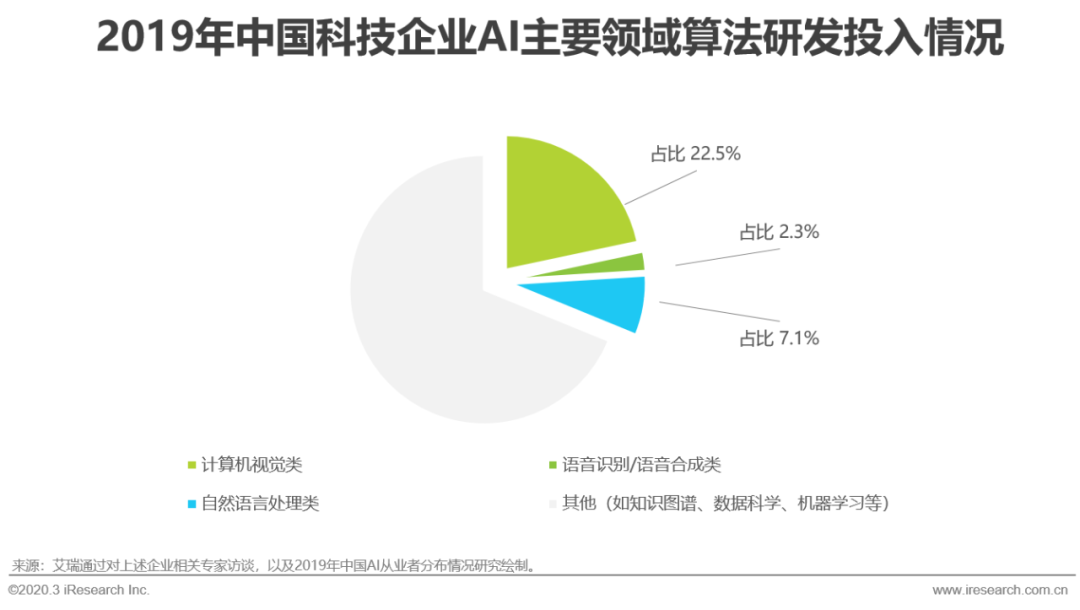根据数据分析,2019年中国科技企业技术研发投入约为4005亿元,其中人工智能算法研发投入占比为9.3%,超370亿元,且大部分投入来自互联网科技公司。主要AI算法应用领域——计算机视觉、语音识别/语音合成,以及自然语言处理占比分别为22.5%、2.3%和7.1%,三者中计算机视觉相关算法研发投入占比最大,这与视觉相关创业公司数量、产业需求和政策导向呈正相关联系,计算机视觉目前仍是中国最具代表性的AI应用技术。