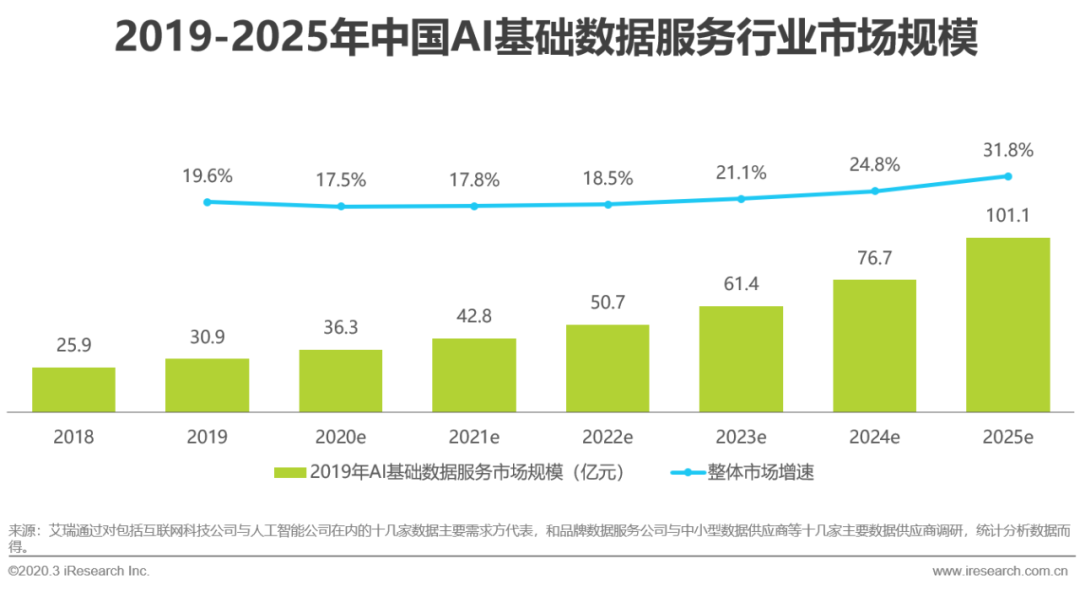 2019年中国AI基础数据服务行业市场规模可达30.9亿元,预计2025年市场规模将突破100亿元,年化增长率为21.8%。