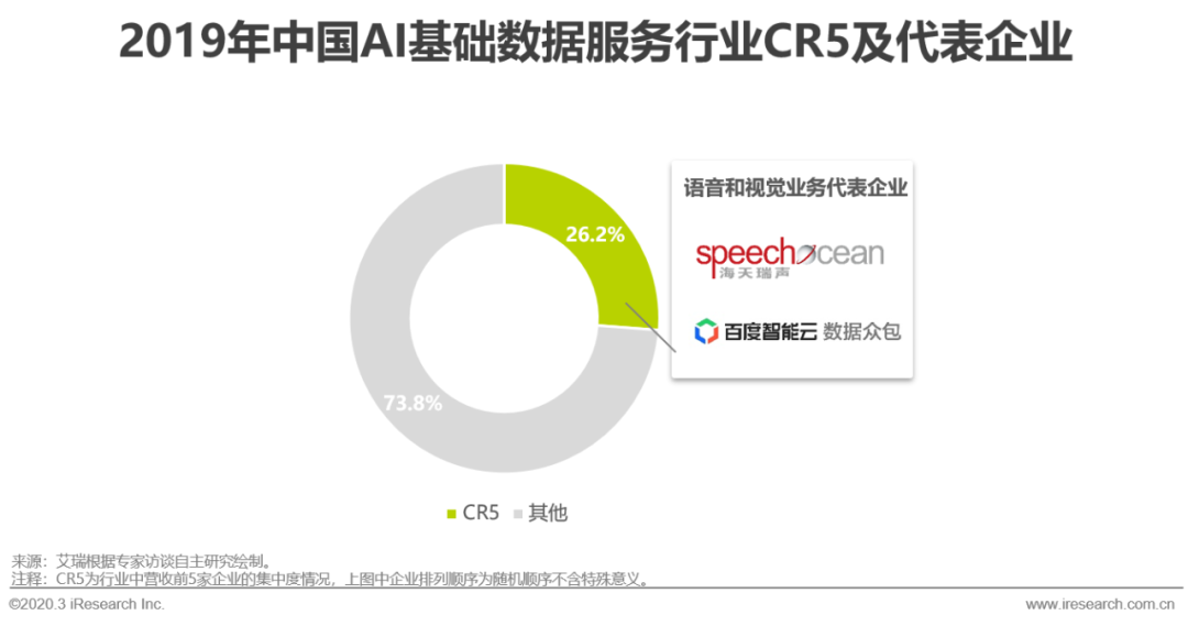 品牌数据服务商、中小数据供应商和需求方自建团队是市场中的主要供应方,在2019年AI基础数据服务市场规模中的份额占比分别为30.4%、47.0%和22.6%,可见中小型数据供应商仍然是市场中的主要供应力量。通过对行业头部公司进行集中度计算,可知2019年AI基础数据服务行业CR5(前五大企业市场份额)为26.2%,处于低集中竞争阶段,行业活力充足,发展空间良好。前五大企业中,海天瑞声与百度数据众包越众而出,据了解国内整体供应方中,以提供图像类数据采标服务的公司居多,内容涉及人像数据、OCR数据、自动驾驶数据等,业务需求较为分散,其中以百度数据众包营收份额占比最大。相比而言,语音类数据需求较为集中,且供应门槛高于图像类数据,内容包含语音识别数据、语音合成数据等,其中以海天瑞声营收份额占比最大。